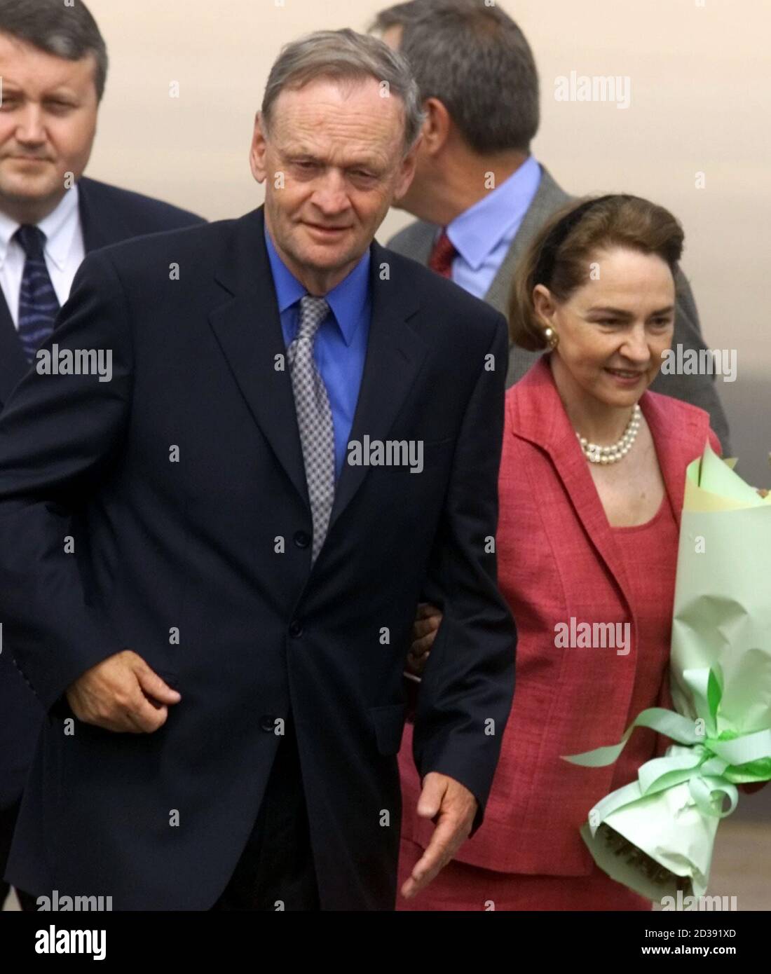 Der Kanadische Premierminister Jean Chretien Und Seine Frau Aline Gehen Bei Der Ankunft In Moskau Am 12 Juli 2001 Zusammen Jean Chretien Kam Zu Einem Arbeitsbesuch Und Wird Die Delegation Seines Landes